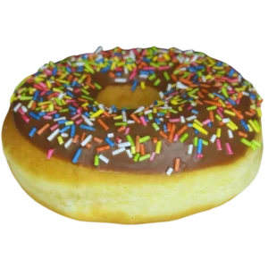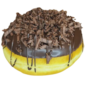 mit dunkler Schokoladenglasur, Streuseln und Vanillecremefüllung